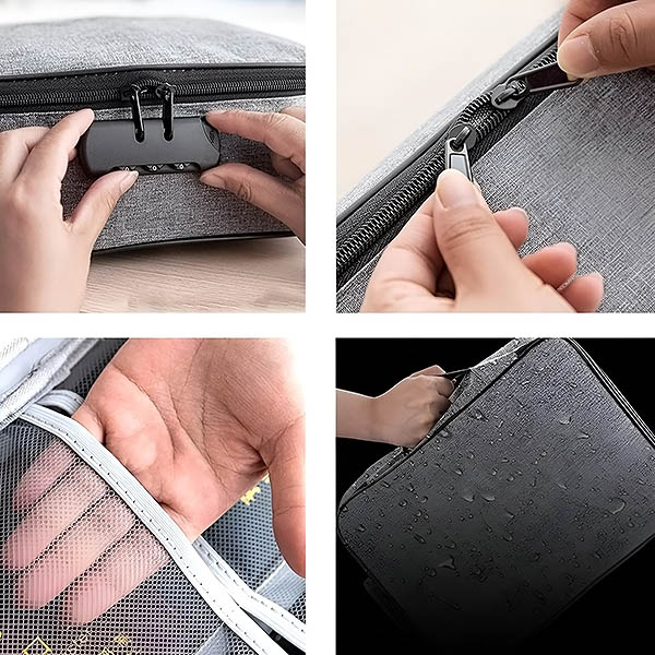 💼 Mettete al sicuro i vostri oggetti di valore! Conservate al sicuro documenti, denaro e gioielli con la nostra borsa impermeabile e protetta da password. Organizzatevi senza fatica grazie ai molteplici scomparti. Ideale per l’ufficio, la casa o i viaggi. 🔒✨