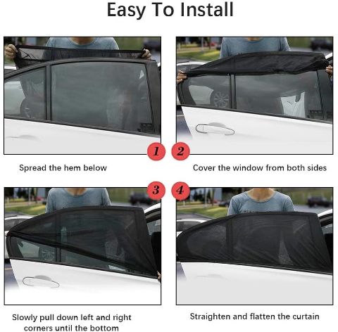 SIDESCREEN è in un panno di maglia di nylon ad alta elasticità, facile da inserire, come mostrato nella foto, passo dopo passo. Non necessita di ventose né colla, copre completamente il finestrino dell’auto.