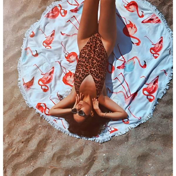 L’asciugamano circolare è pensato per il relax in spiaggia o in piscina, ma può anche essere indossato legato intorno al corpo come un indumento.